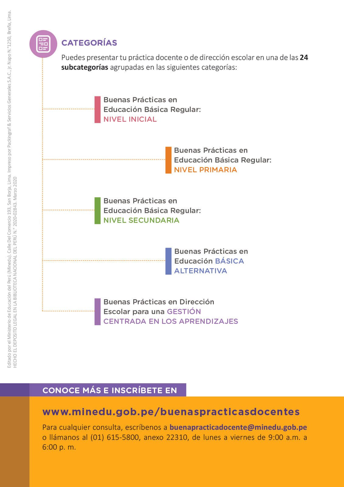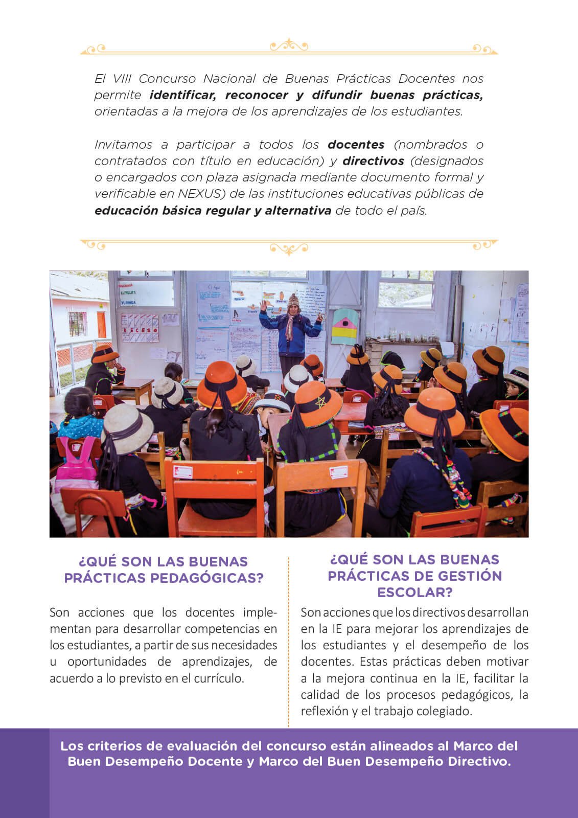 Brochure made for the “8th Educational Best Practices Contest”, organized by the Ministry of Education of Perú. This contest aims to recognize all the best practices that were successfully implemented by teachers at schools, all over the Peruvian country, at kindergarten, primary, secondary, and basic alternative educational levels.