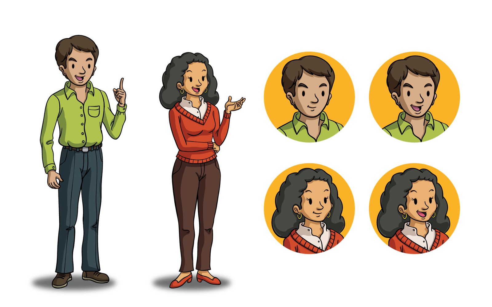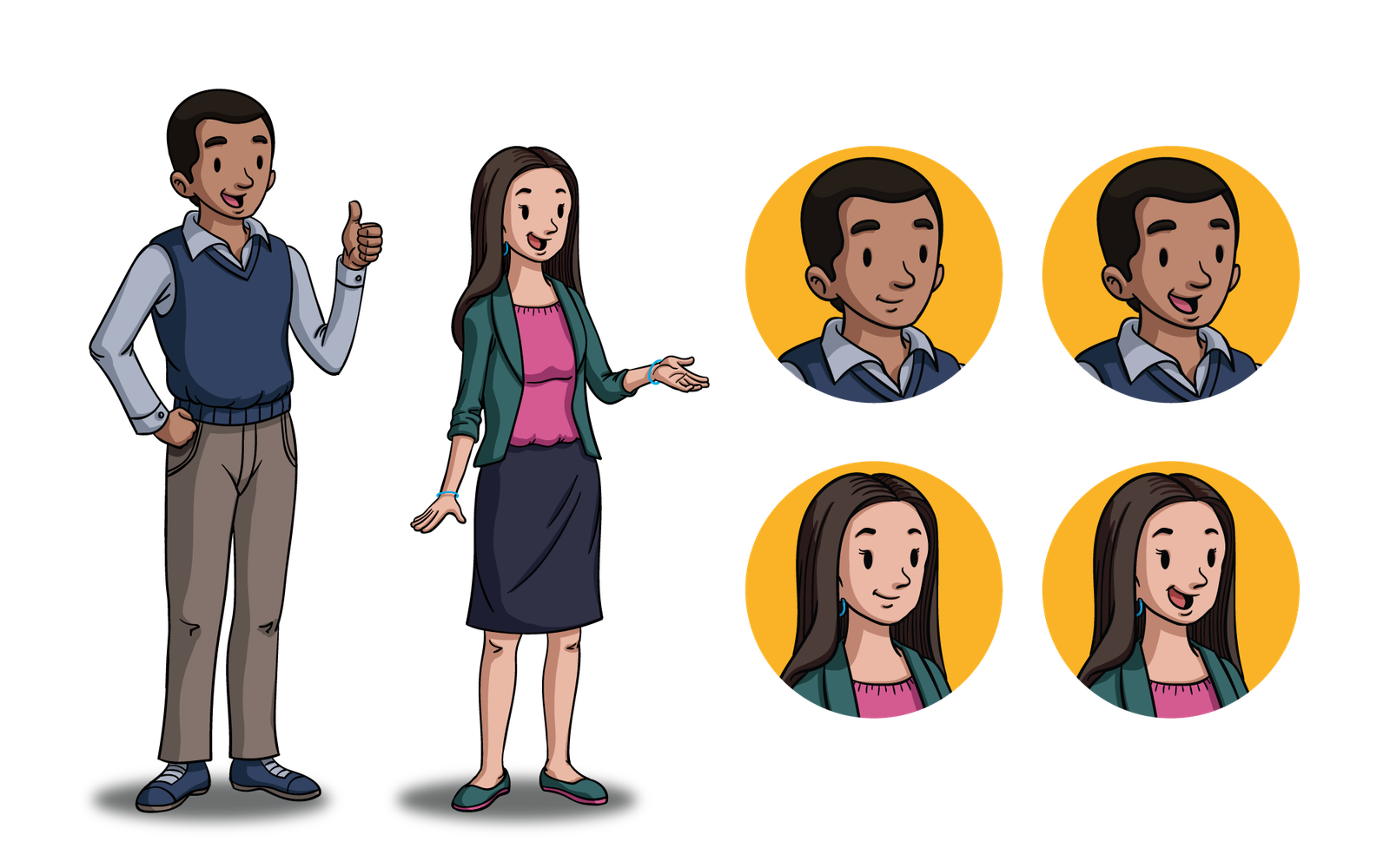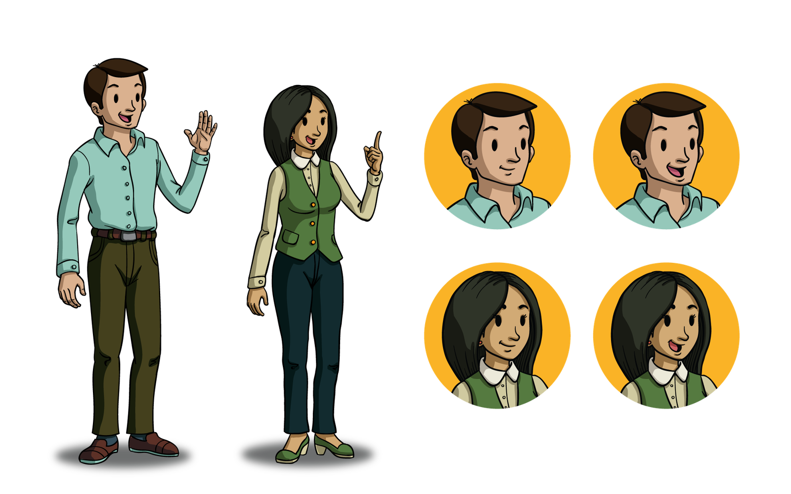 I designed three male and three female characters, each depicted in casual attire. Their poses varied, even when standing, and their facial expressions alternated between open and closed mouths to represent speaking and silent moments. This diversity allowed me to match their gestures and expressions to the specific content of each course.