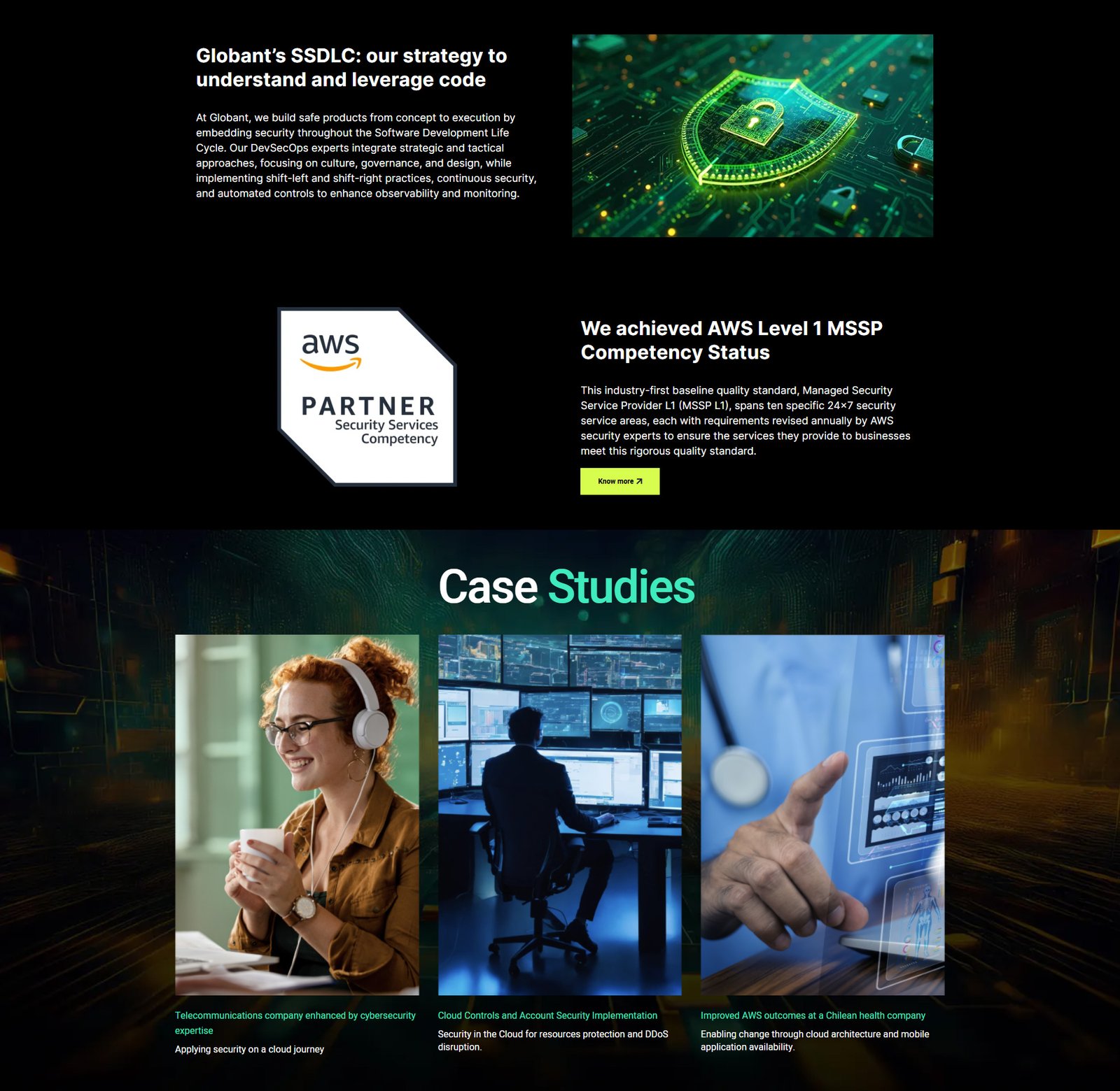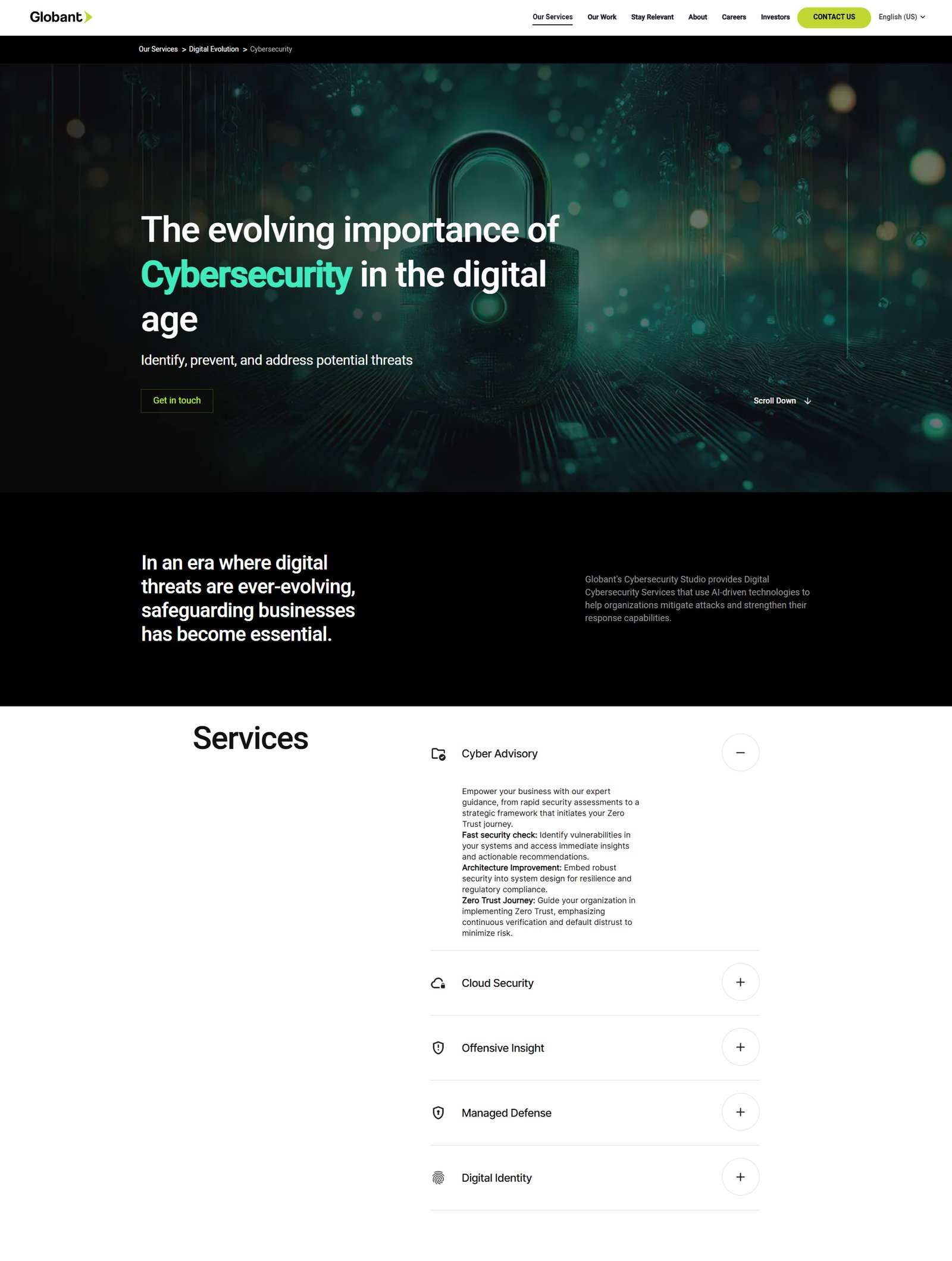 This request was about the main landing page for Globant Cybersecurity Studio, a page aiming to showcase its expertise in attack mitigation and response capability strengthening. It successfully presented the Digital Cybersecurity Services that utilize AI-powered technologies, ranging from Cyber ​​Advisory and Cloud Security to Managed Defense and Digital Identity.