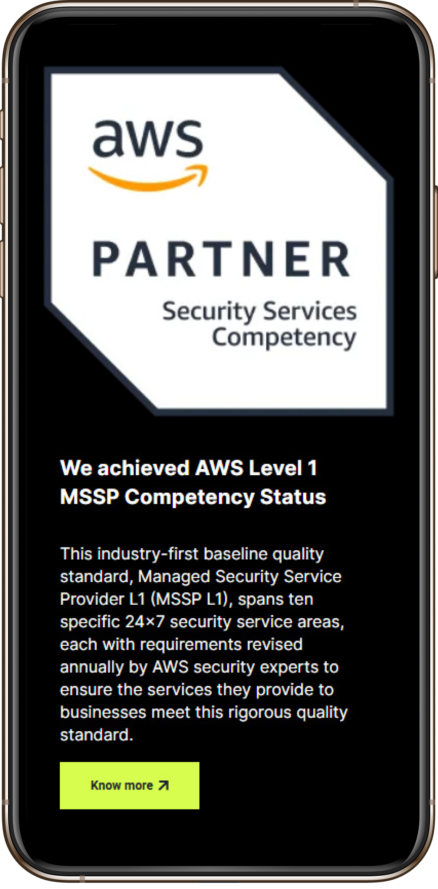 • Highlight the achievement of a rigorous industry quality standard: AWS MSSP Level 1 Competency status, which requires compliance with ten specific areas of 24/7 security service.