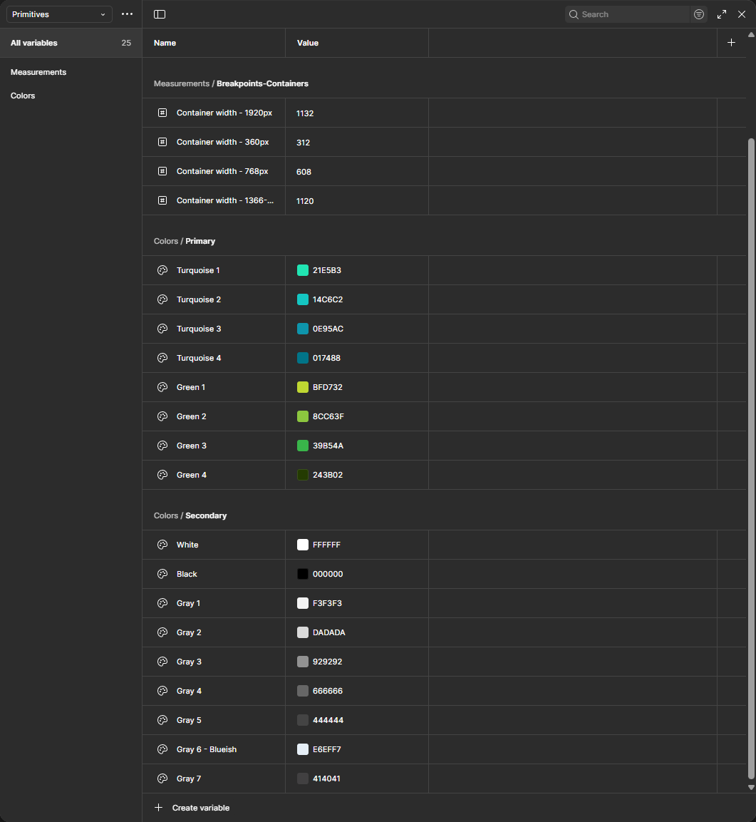 - Primitives: This is where the breakpoint measurements are, together with the color palette, both primary and secondary colors.
