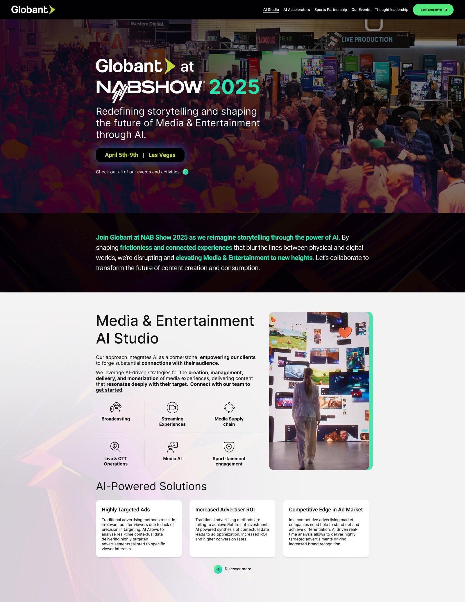 - Establish a robust visual hierarchy, dedicating the initial hero section to the central theme of “Globant at NABSHOW 2025,” supported by immersive imagery.