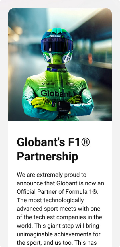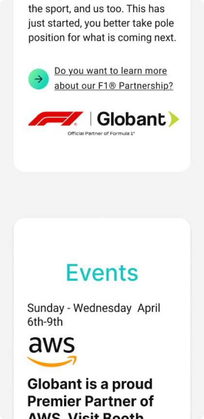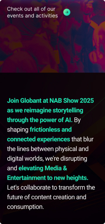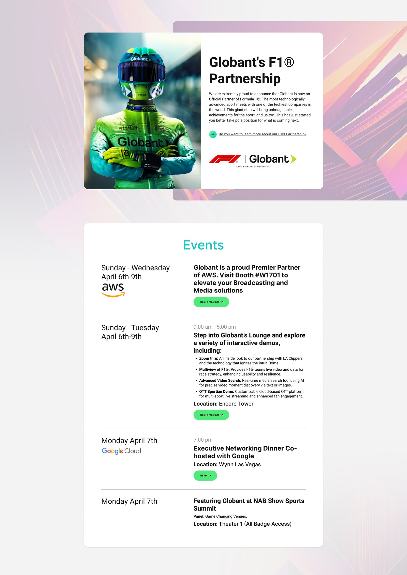 This is a high-impact landing page to promote Globant’s presence at NABSHOW 2025. The design has focused on highlighting how the company is “Reimagining the world of Media & Entertainment through AI”. Key information was incorporated, such as the detailed event schedule and specific details regarding Globant’s AI-Powered Solutions, the AI Studio, and their F1® partnership.