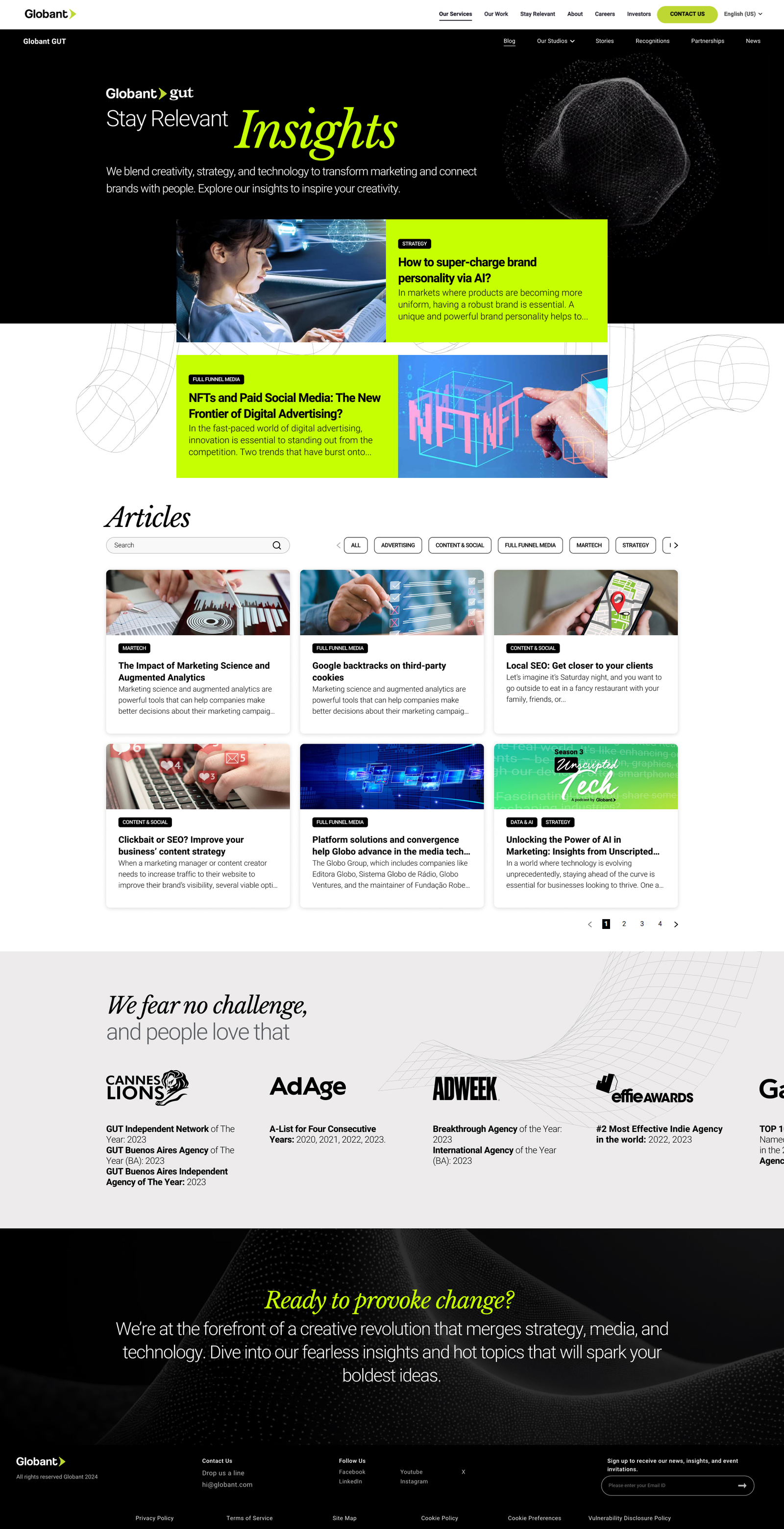 The following involves the work on the “Stay Relevant Insights” landing page for Globant GUT, which aimed to present articles and stories that merge strategy, technology, and creativity. The page sets a key knowledge hub for the brand, allowing users to explore perspectives designed to inspire their creative processes.