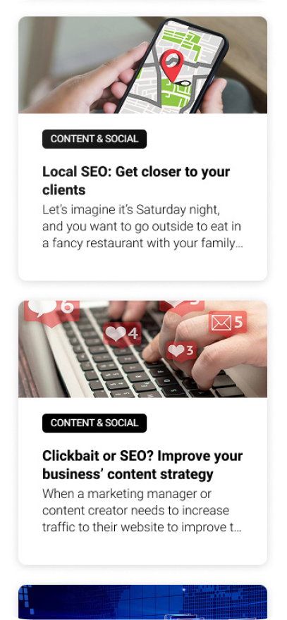 - A robust category system that allows users to easily filter articles by key areas such as ADVERTISING, STRATEGY, and CONTENT & SOCIAL.