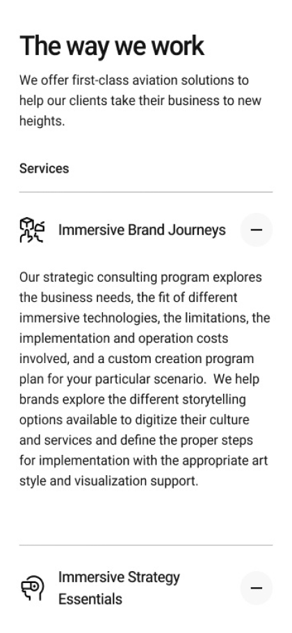 - A high-contrast design system was implemented, featuring a dark background to convey the immersive and futuristic nature of the studio offering.