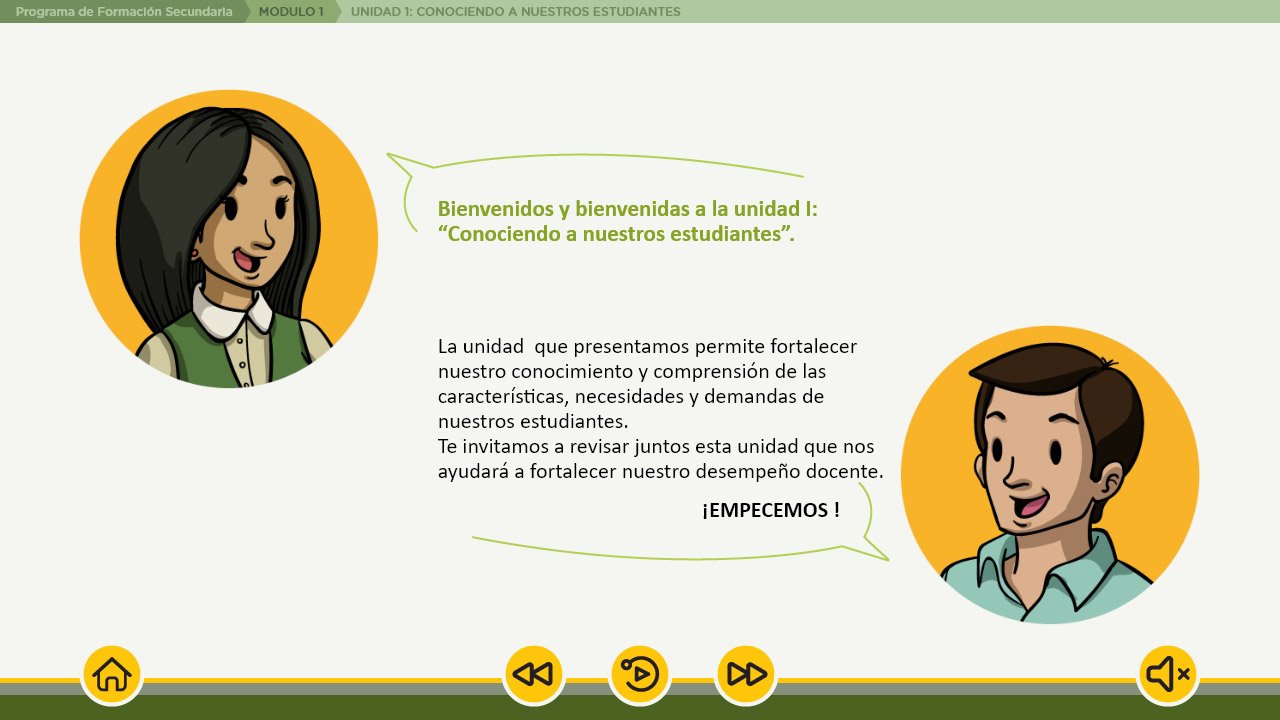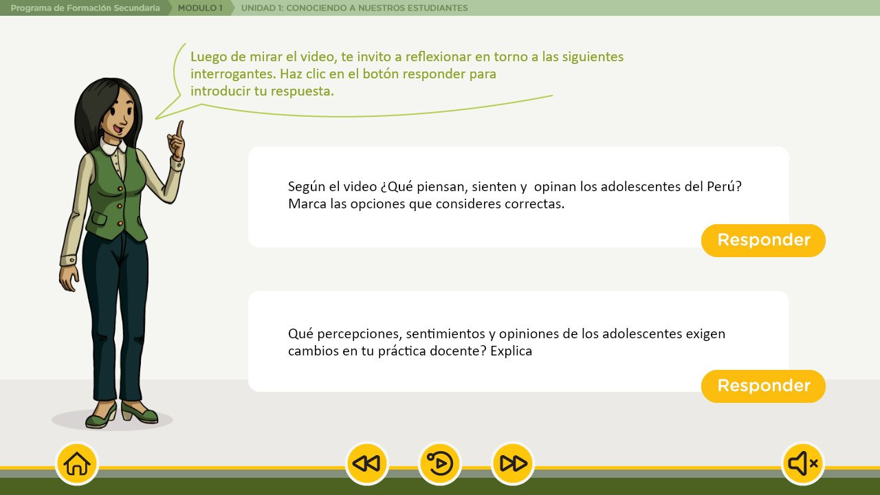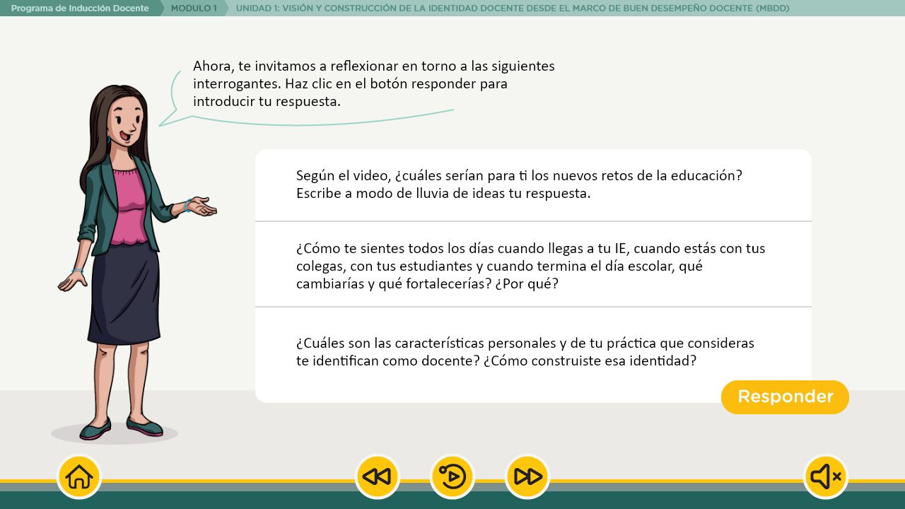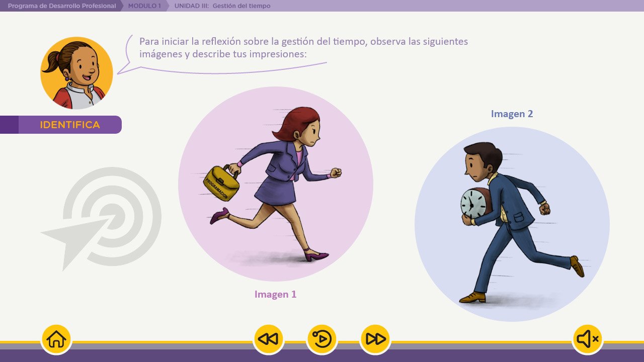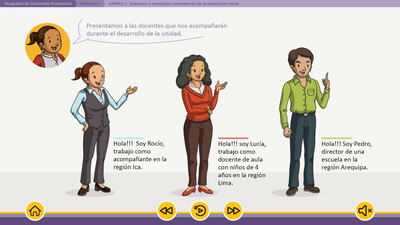 Each virtual course module was created following the design guidelines, focusing on the clarity not only of the information but also the one for the interface, navigation, and interaction of the characters (hosts) with the viewer, in the different scenarios like content explanations, dialogs between the characters, and requested exercises.