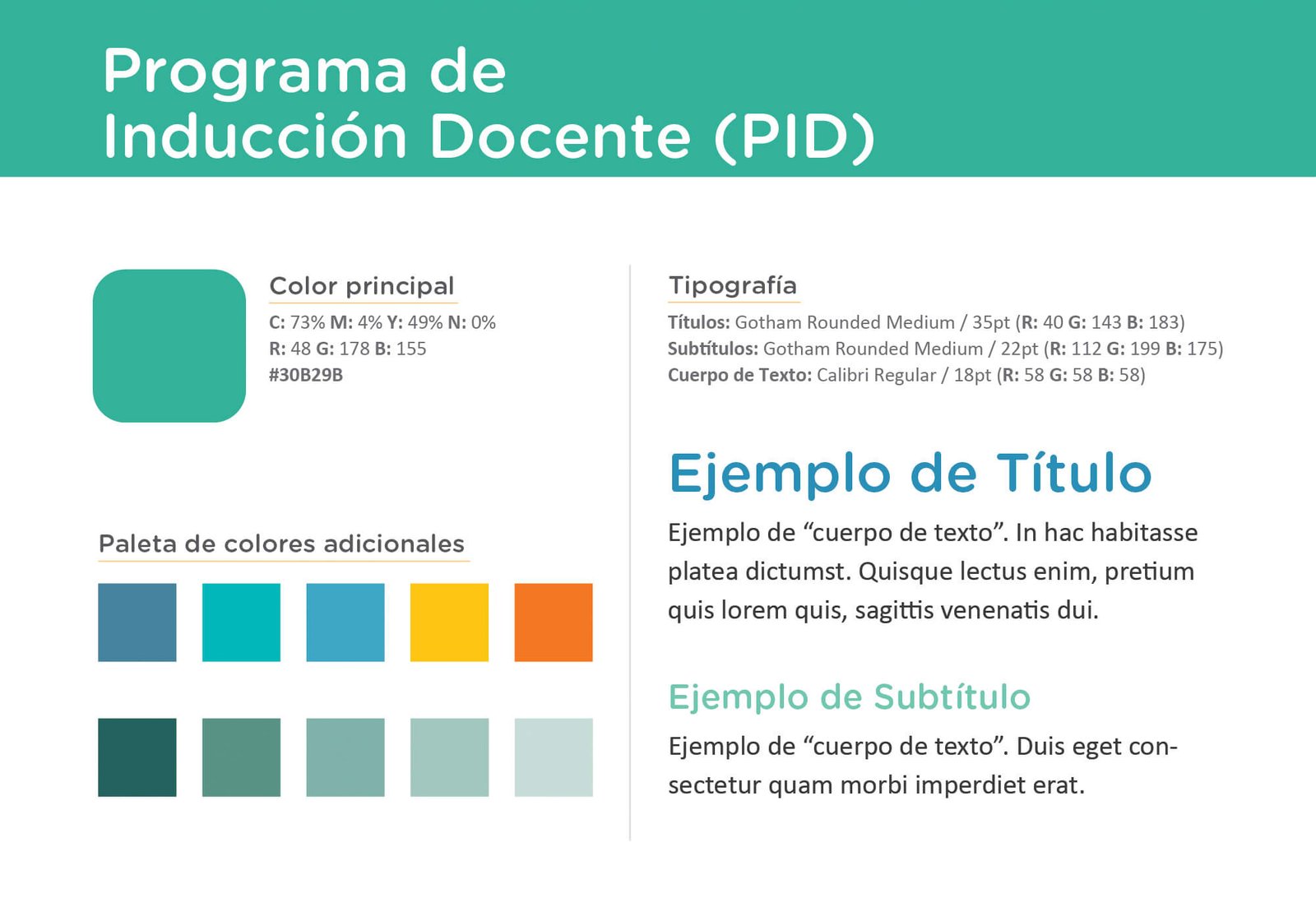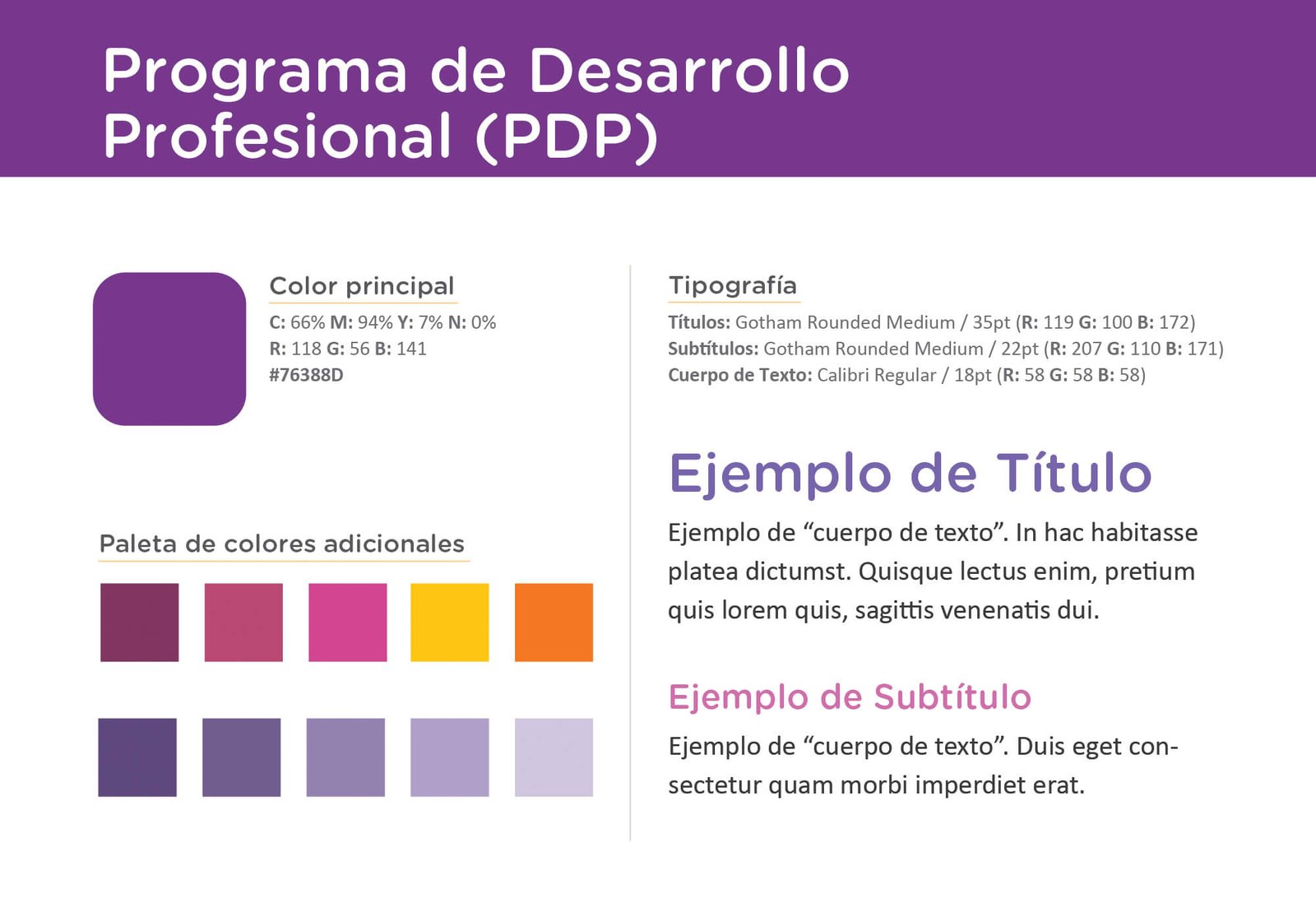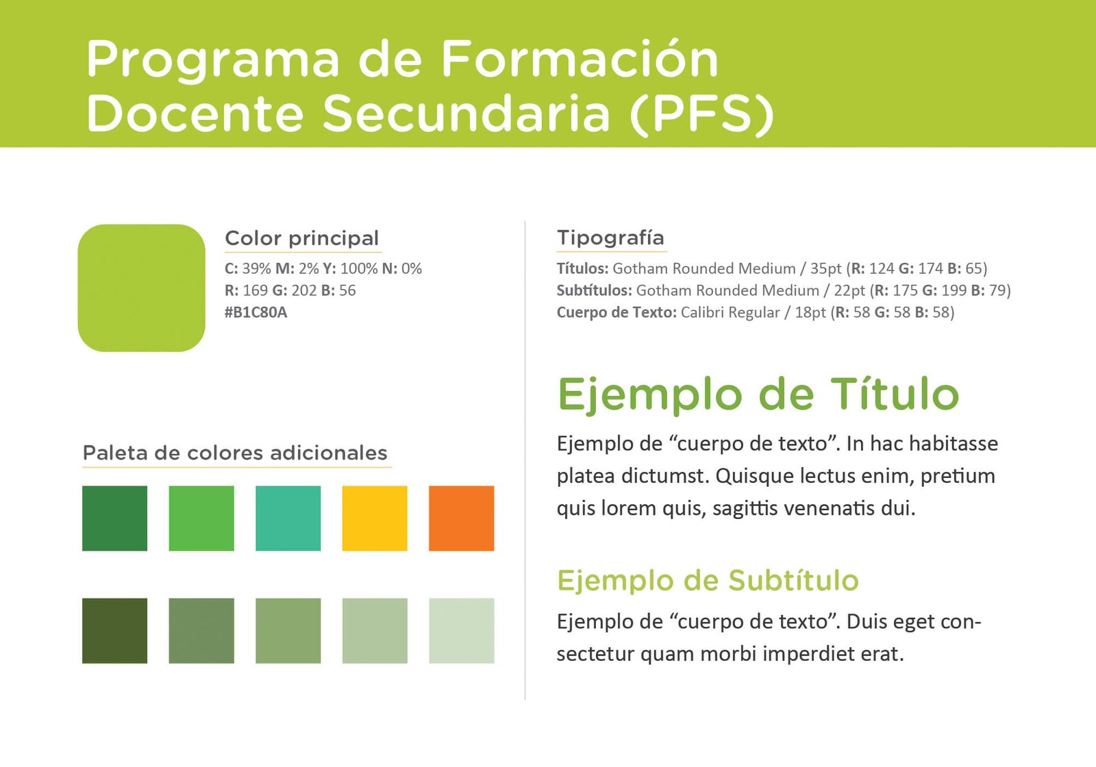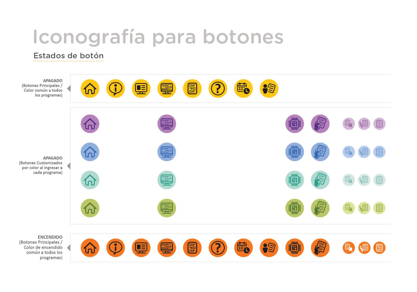 The main design guidelines for the courses interface: the primary and secondary colors palette for the different programs, the typography, text sizes, and the icons used in all the screens, were proposed in advance to the client. Following is the approved style: